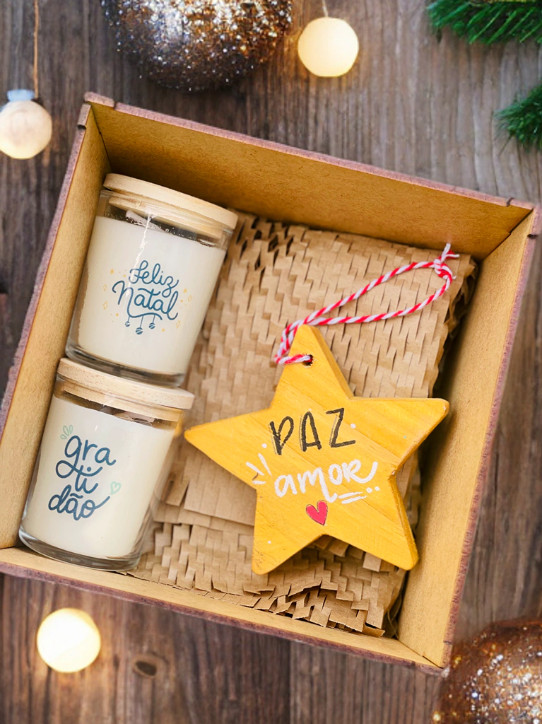 Surpreenda-se com nosso Kit em caixinha de MDF (15x15x10) que vem com uma tampa adesivada, oferecendo duas mensagens encantadoras para você escolher! É o presente perfeito para iluminar o Natal de quem você ama.