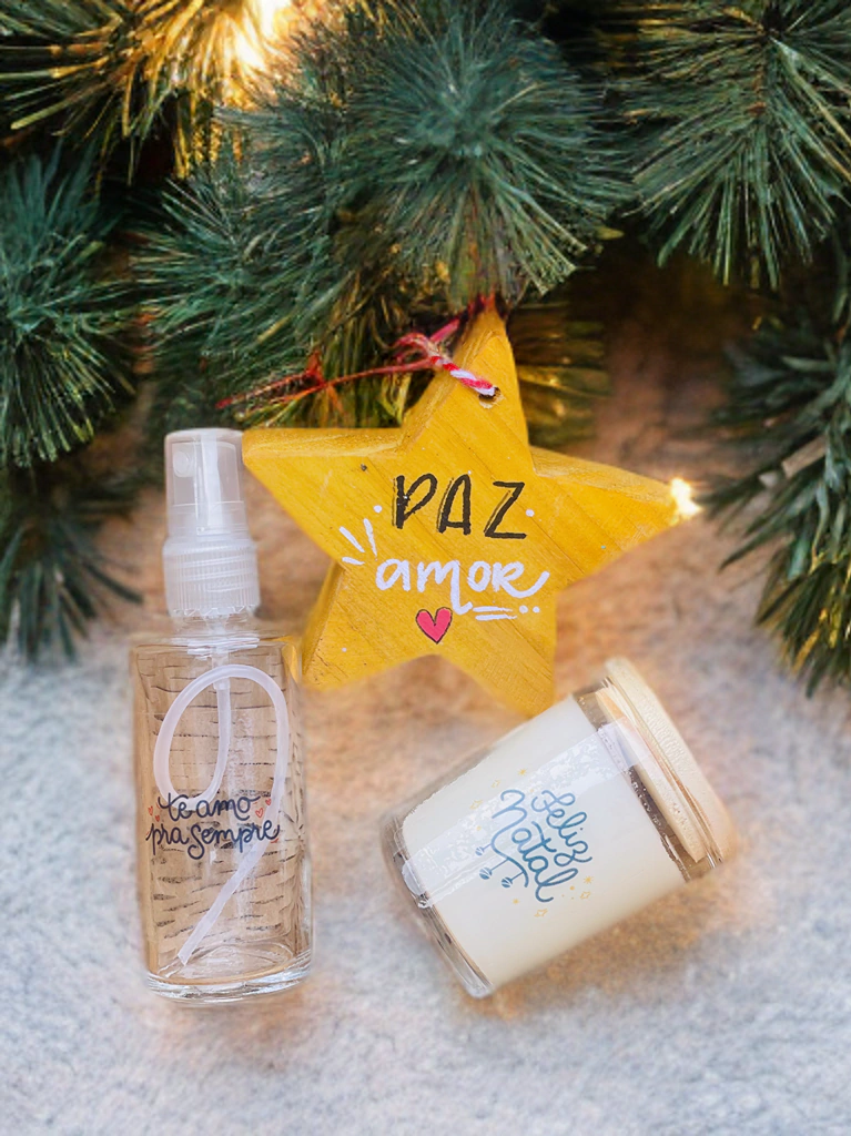 Escolha entre as três opções incríveis: 1. Kit com 3 velas 2. Duas velas + 1 estrela 3. 1 vela + home spray "Te amo pra sempre" + 1 estrela