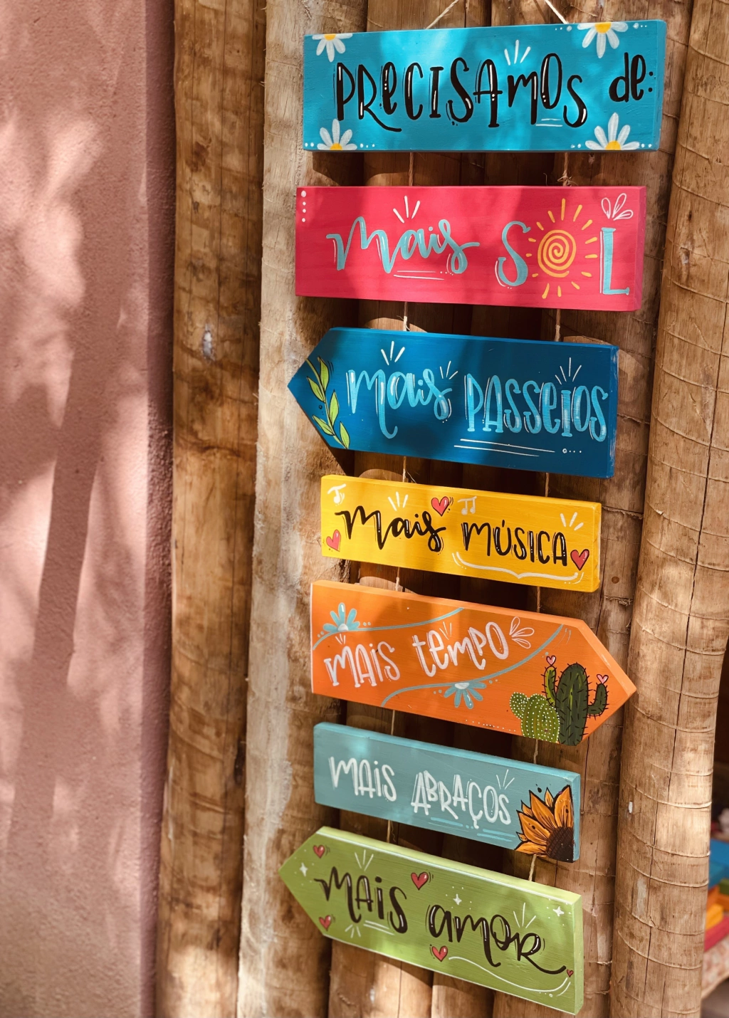Precisamos de mais sol, mais música... Interligadas amb. Externo é uma peça única feita à mão em madeira pinus, ideal para trazer um toque especial ao seu espaço. Com tamanhos que variam entre 7x25cm e 8x30cm, e uma altura aproximada de 69cm, essas placas são perfeitas para decorar sua varanda, jardim ou qualquer ambiente que precise de um pouco mais de alegria.
